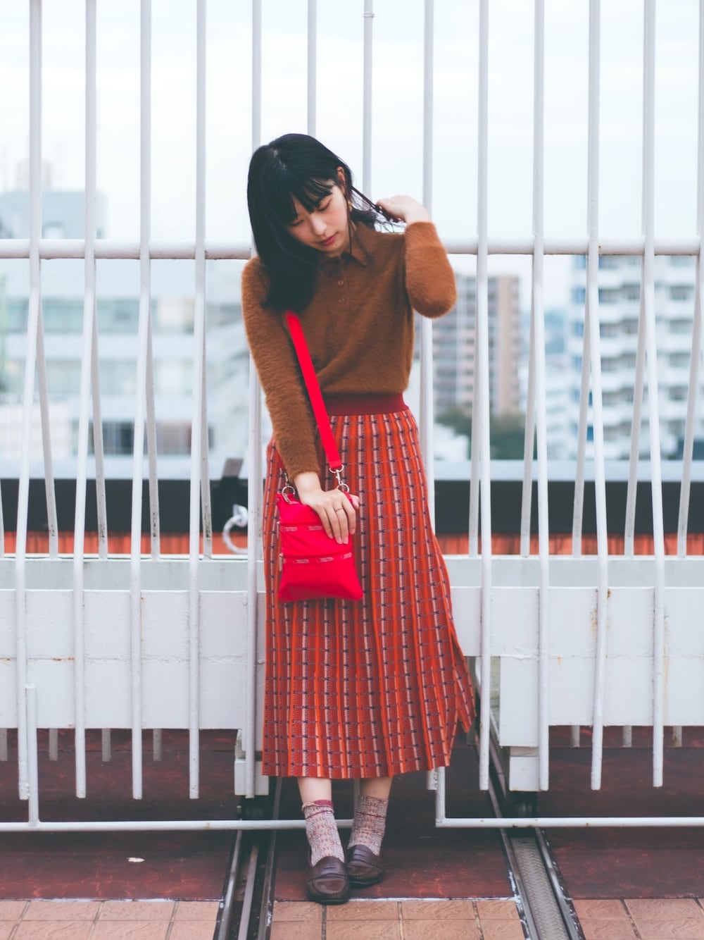 茶色・橙色・赤色 のスリートーンでまとめた暖色系コーデ。🤎🧡❤ Ray Cassinのニットスカートは、お店で一目惚れして衝動買い…👛💸 この絶妙なオレンジ色と、謎の柄と、そしてプリーツのような立体加工がツボでした笑 Tabioの靴下も一目惚れして買いました!ラメと細かい模様がめちゃくちゃ可愛い、クラシックな1足です🥰 ローファーとの相性抜群なので、この秋たくさん履きたい💭