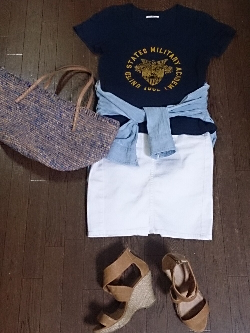 GUの白デニムスカートでもうひとコーデ。 スカートが気に入りすぎて色々合わせてたくなっちゃいます。 ボーダーと合わせても可愛かったけど、ネイビーのTシャツで引き締め。 デニムシャツ腰巻きでカジュアルに。 ベージュの靴とかごバッグにはこっちの方が合うかも。