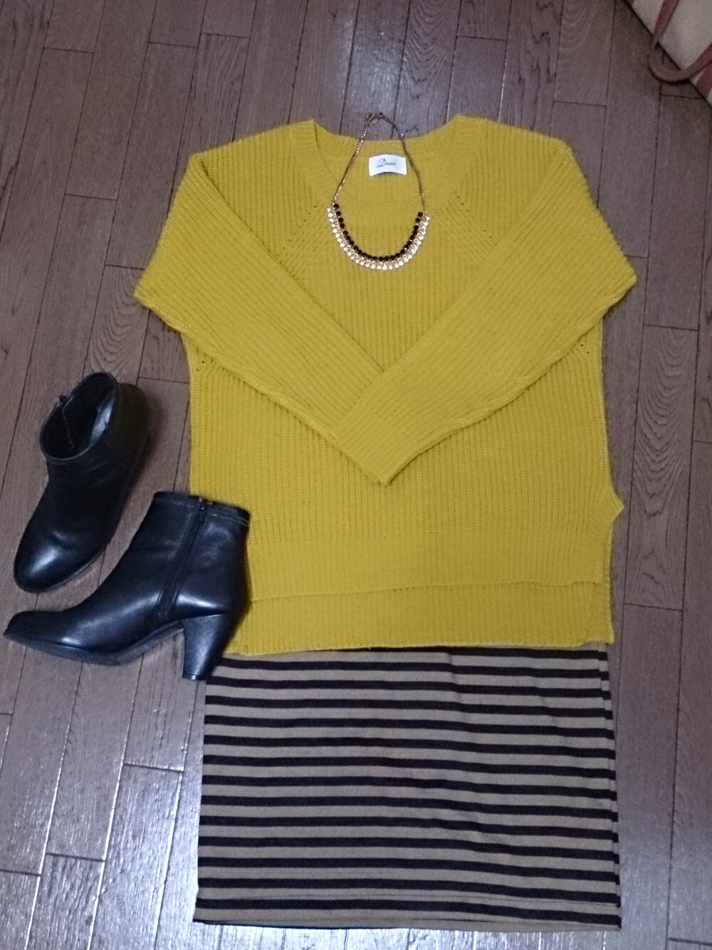 寒いです。 今年のsaleで買った物を着たい! でも寒くてスカート無理。 毎日ボトムはタイツに長ズボン重ねてしまいます。 なので、妄想コーデw saleで買ったイエローニットとボーダースカート組み合わせて見ました。 こんな感じで早く着たい~・゜・(つД`)・゜・ ピーコさんに「おしゃれは我慢よっ!!」って怒られても寒いのムリなんです~w