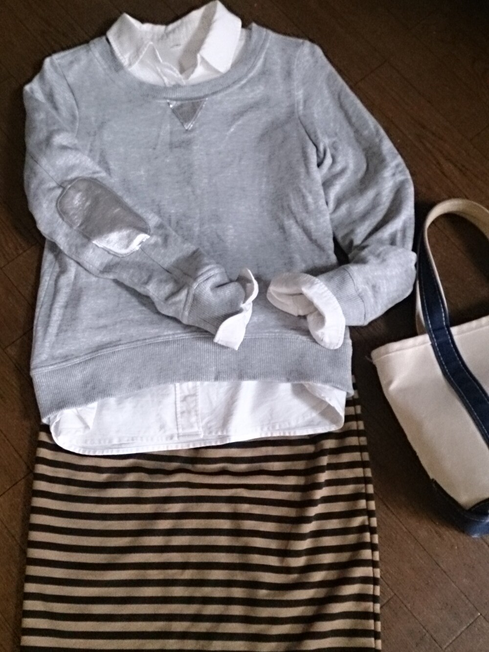 ボーダースカートで妄想コーデ再び。 早く履きたい~!寒くてムリだけど~。 なんかRGのあるある言いたいみたいになってきてるw これにアウターはやっぱGジャンかな~? 妄想が膨らみますなw スウェットはGAP。 このスウェット後ろが少し長めなの。 レザー部分がシルバーで。 先週有楽町LUMINEに着ていったら、とあるショップのお姉さんに「そのスウェット可愛いですね☆」と嬉しいお言葉。 テンションMAXになった事はいうまでも無いですよねw! もちろんsaleでゲット。1790円♪ 近所のGAPで1点だけ残ってたのがなんとXXS。オチビで良かった!と思う数少ない瞬間(笑) ちなみに白シャツは無印です。