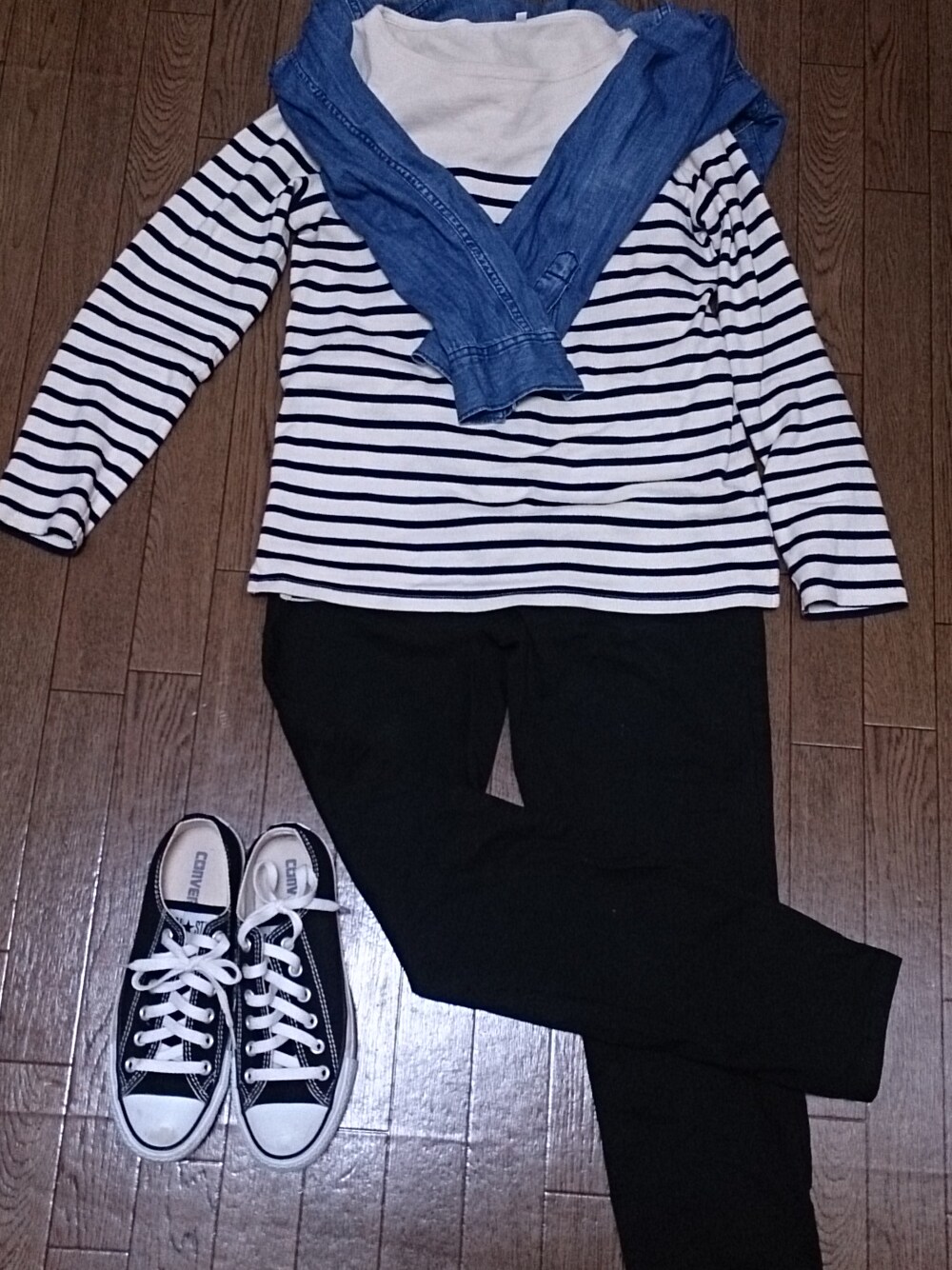 もうひとつコーデ考えてみました。 ボーダーT 無印 1980円 デニムシャツ GAP 2900円(半額sale) パンツ UNIQLO 1290円(週末特価) スニーカー コンバース 3480円(楽天) 総額9650円なり~♪ デニムシャツはインに着ても羽織っても腰巻きしても良いよね。