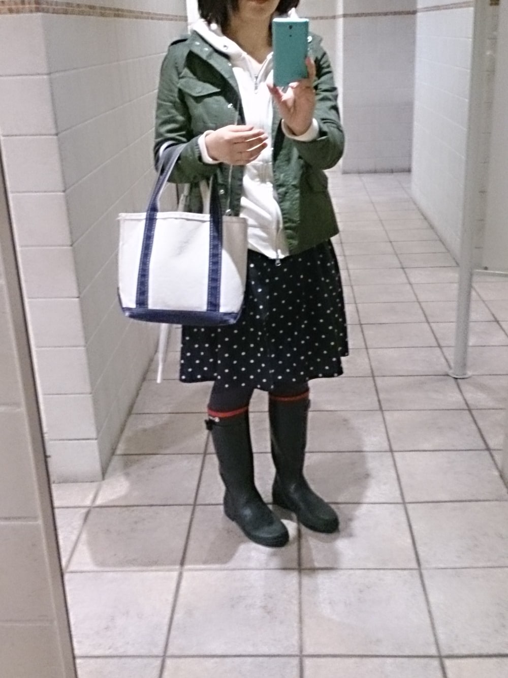久しぶりです。お洋服もちょこちょこ買っているのでアップしたいのですが。中々です。はい。 雨の日コーデ。 パーカーとワンピースは無印良品です。 ミリタリージャケットはNBB 雨の日もトート。買いかえようと思ってるので濡れても良いや… …って結構前から思いながら買い換えず使ってますがw