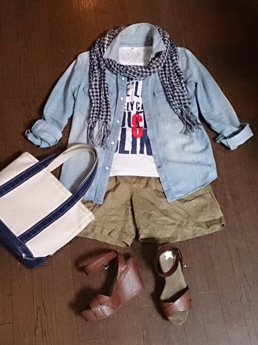 オチビなのでショートパンツは厚底サンダルと合わせてなるべくバランス良く。 膝頭におっさんの顔が浮かぶお年頃なので、私はさらに7分丈のレギンスはきますがw 羽織ったり巻いたりが便利なデニムシャツとリネンのストールを合わせて。