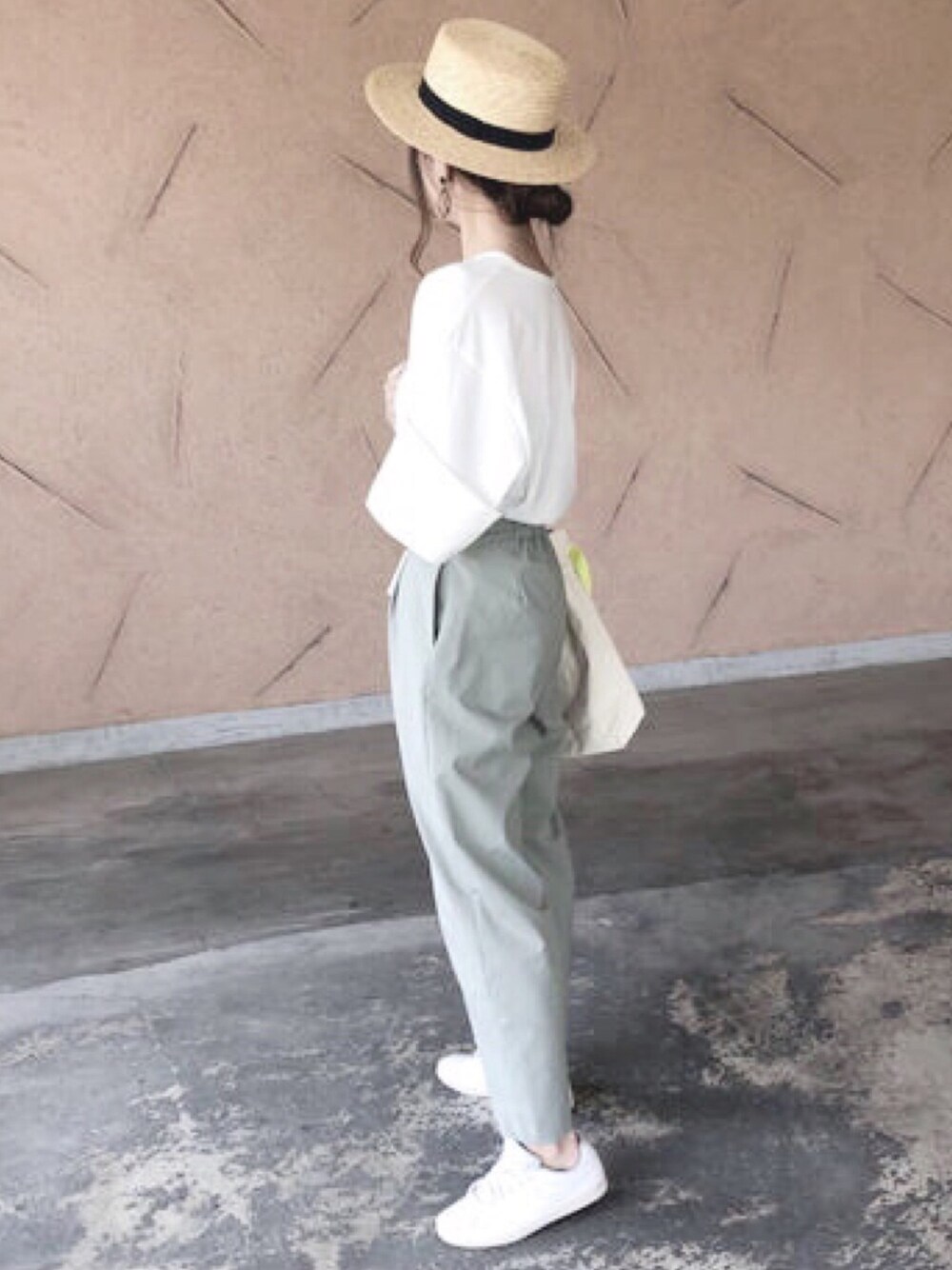 グリーンカラーのパンツに Tシャツ合わせ♡ カンカン帽春コーデ🌼 ご覧頂きありがとうございます😊♡