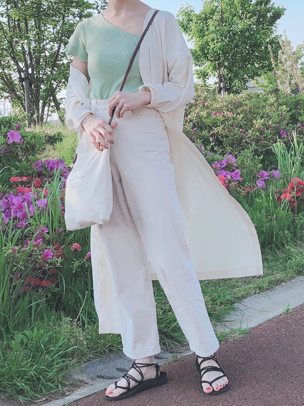 公園コーデ🌸 ホワイトにミントグリーンが差し色♪ アシンメトリートップスはSPIRAL GIRLさんのもの♡ 本日ZOZOタウンで使える2000円offクーポン配布中(^^) 是非チェックしてください😊