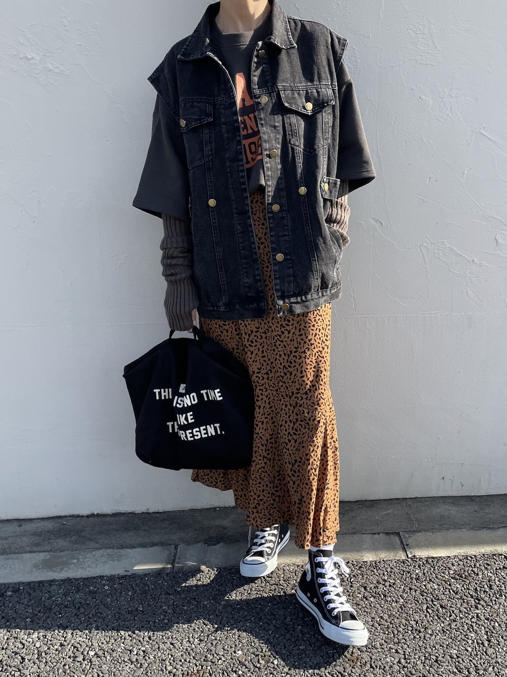 デニムベスト × ロングスカート マーメイドラインのレオパードスカート♡ デニムベストと合わせてカジュアルの🫶🏻