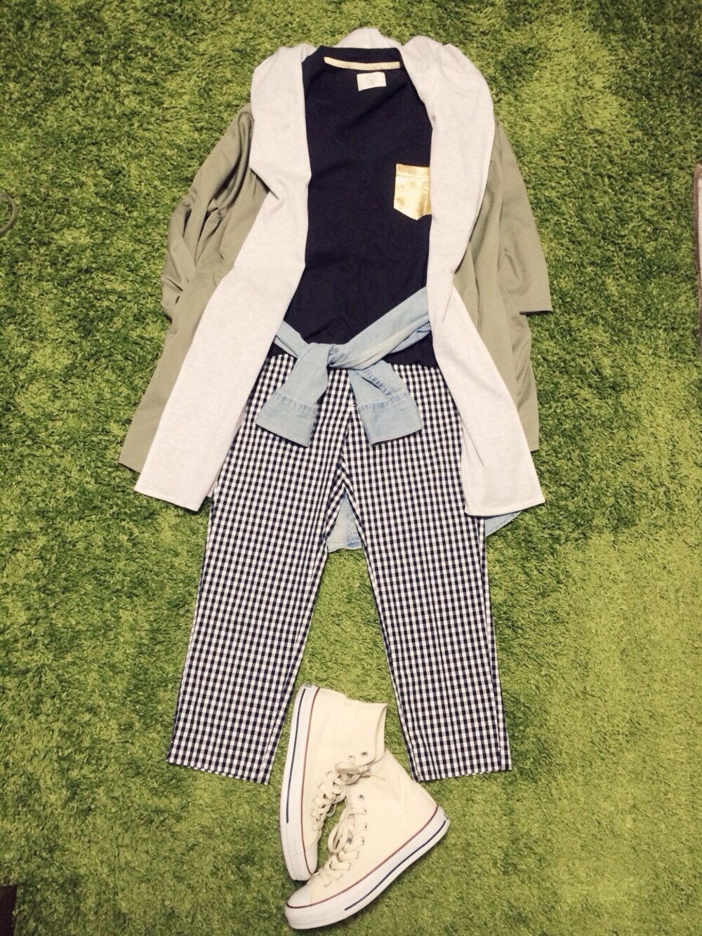 プチプラでgetしたギンガムチェックのクロップドパンツ♡ 形がキレイだから合わせやすそう꒰ ♡´∀`♡ ꒱ アウター:アーバンリサーチ Tシャツ:Duffer デニムシャツ:GAP