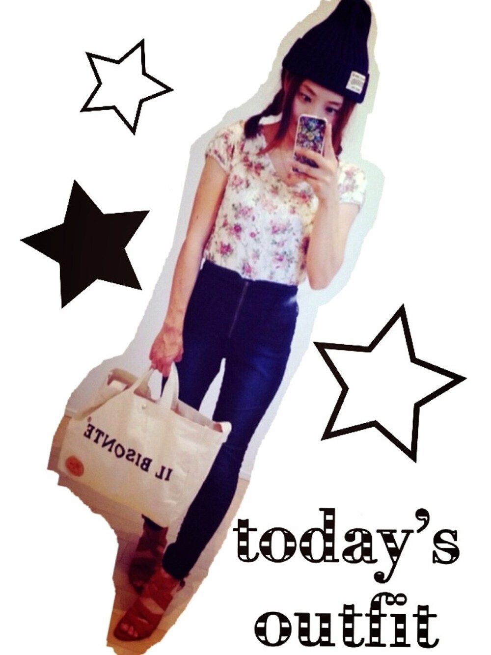 花柄Tシャツ...しまむら ハイウエストパンツ...しまむら ニットキャップ...楽天 サンダル...salus バッグ...IL BISONTE