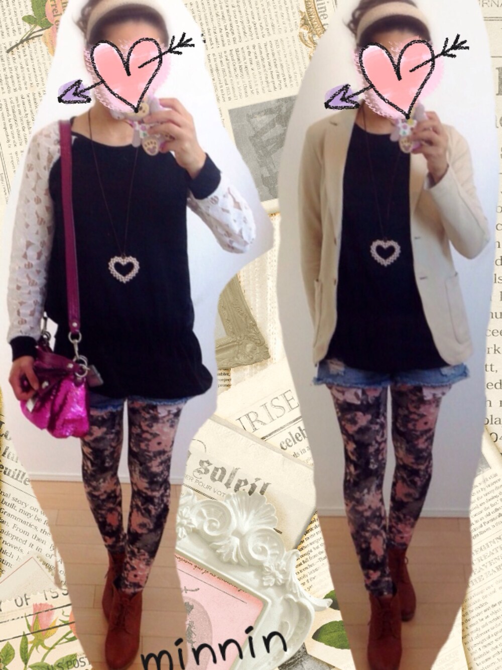 ジャケット...UNIQLO レースロンT...shuしゅぅろんぽ ショートパンツ...しまむら レギンス...GU ブーツ...UNIQLO バッグ...COACH