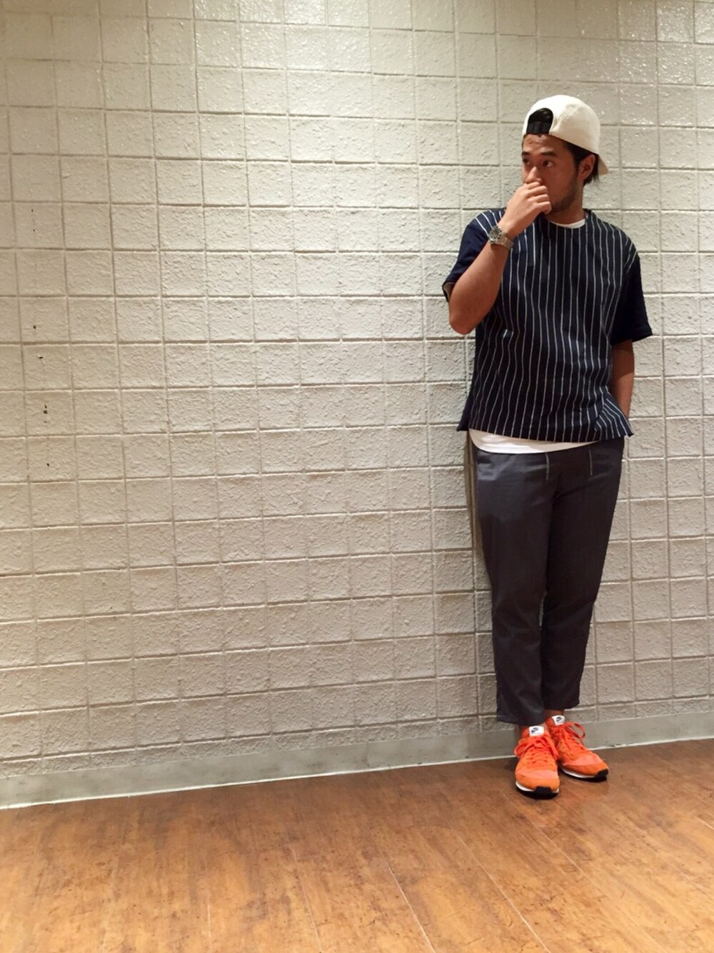 キャップにストライプTシャツとスポーティながらも、ツヤ感のあるきれい目なドローコードパンツをあわせ、差し色にオレンジのシューズをチョイスしました☆