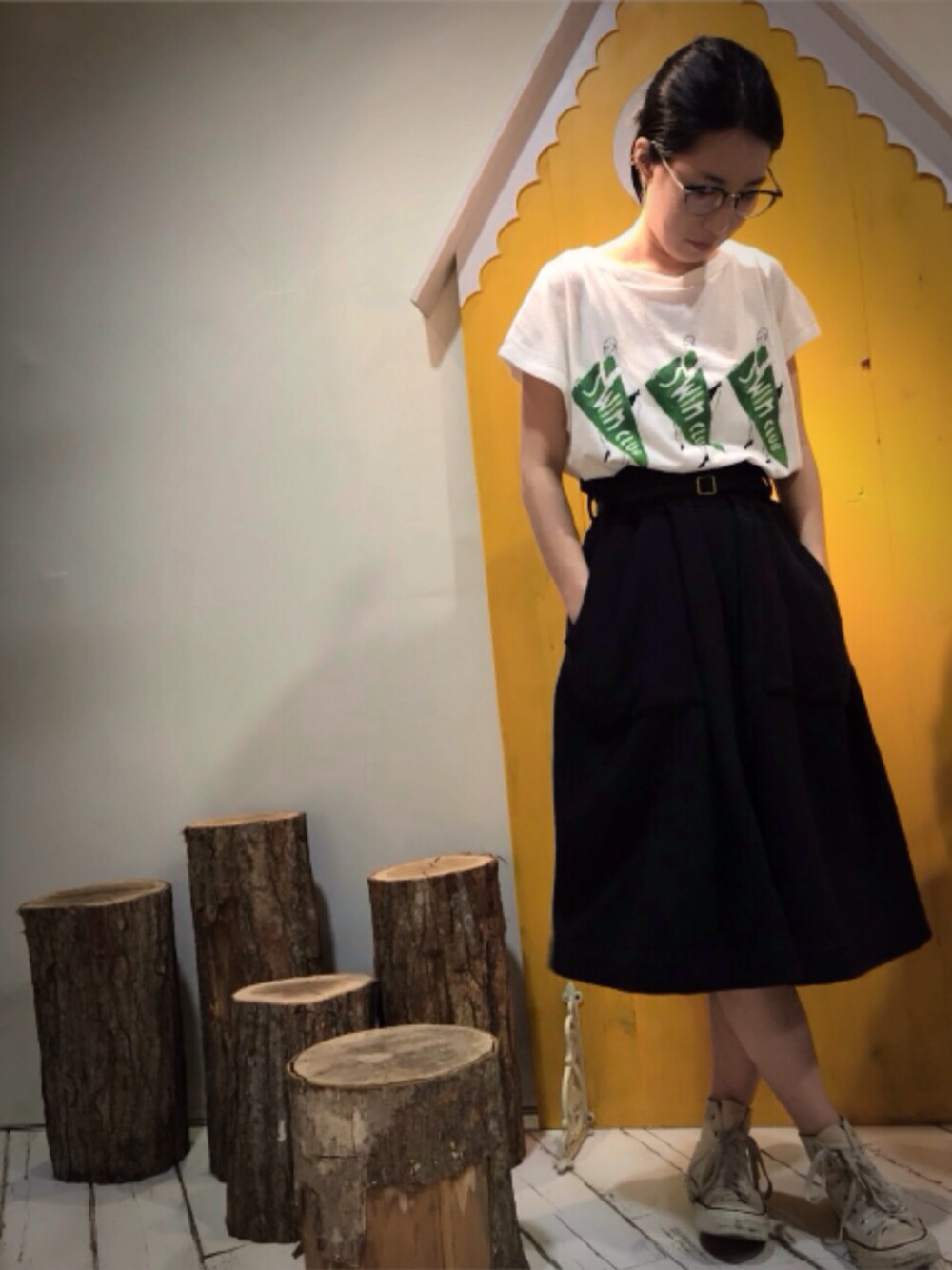 オール フィルメランジェアイテム!SWIM CLUBの女性プリントが目を引くTシャツがより引き立つように シャツインでややハイウエストのスカートと合わせてみました♪