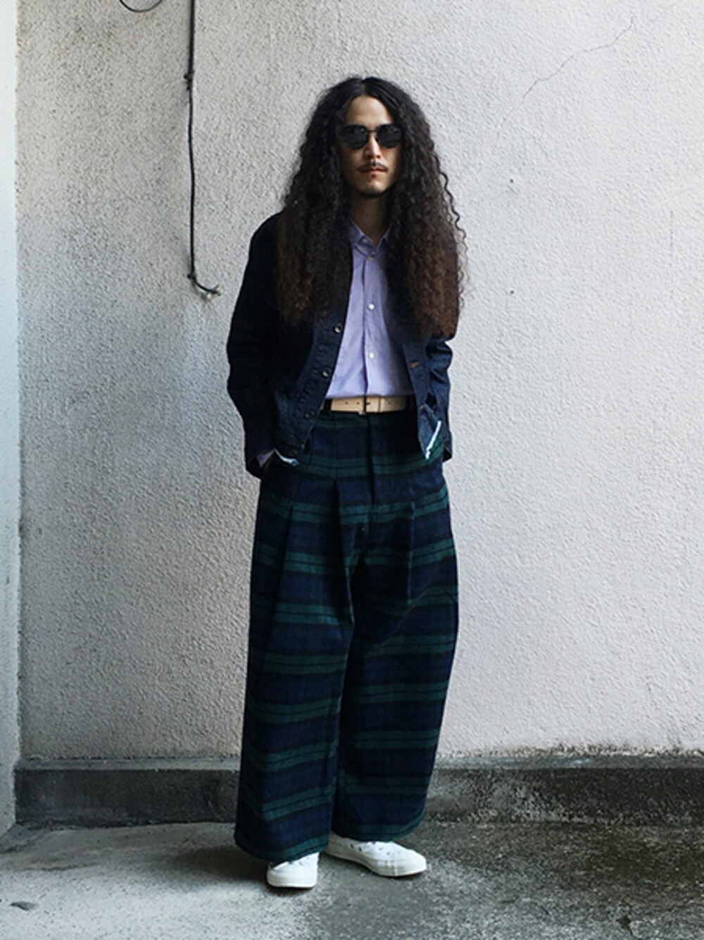 ・outer 【ESSAY】 J-2 INDIGO ----------------------------------- ・inner 【ESSAY】 SH-1 LIGHT PURPLE ----------------------------------- ・belt 【ESSAY】 A-2 NATURAL × BLACK ----------------------------------- ・pants 【SHINYA KOZUKA】 FLANNEL BAGGY PANTS BLACK WATCH ----------------------------------- ・eyewear 【MYKITA】 ANNTI Black / Antigua ----------------------------------- ・shoes 【ELEY KISHIMOTO】 HI CUT SHOES WHITE × WHITE