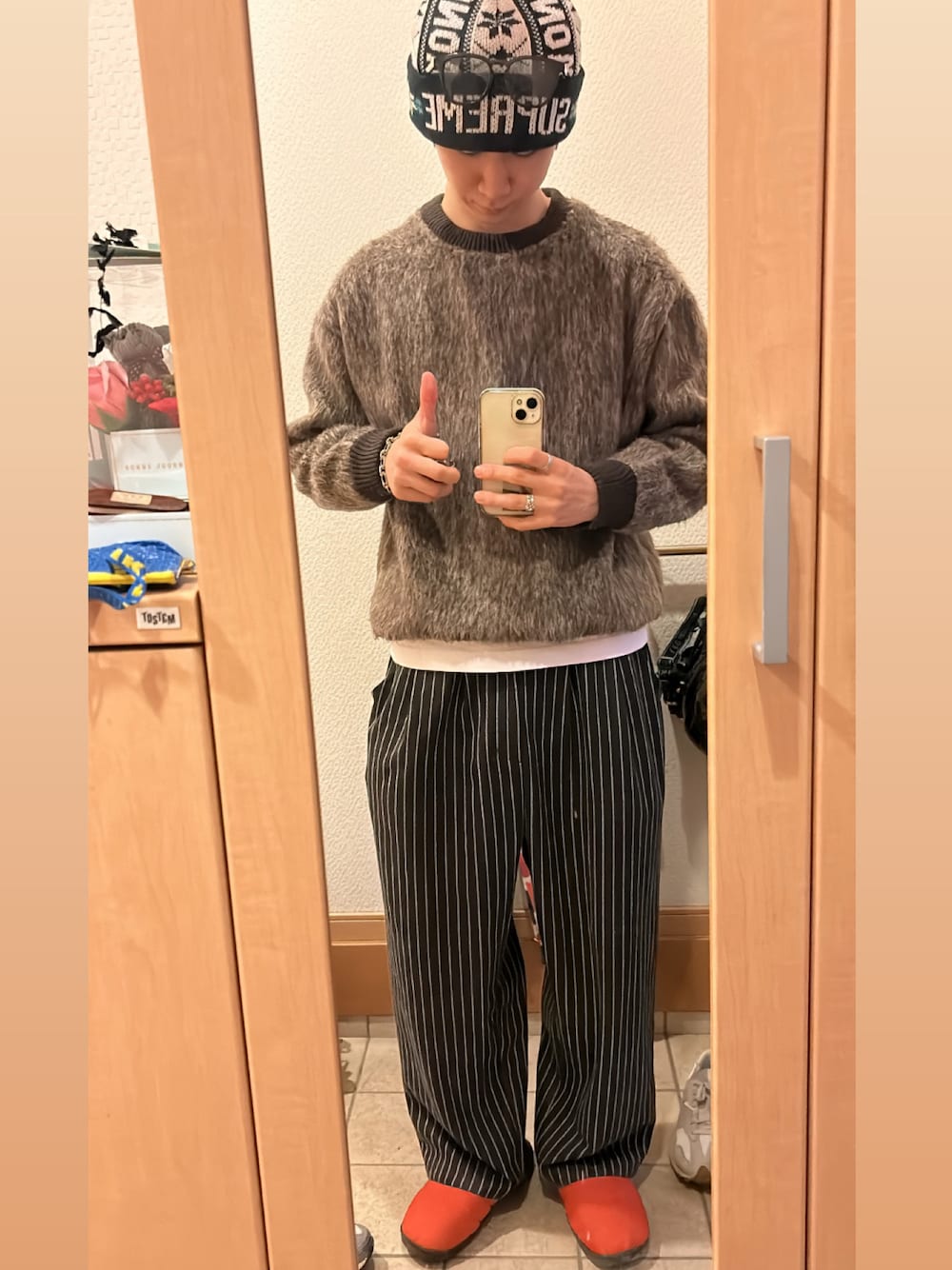トップスニコアンドのプチプラコーデです! このストライプスラックスはシルエットも良くて、年中使えます!