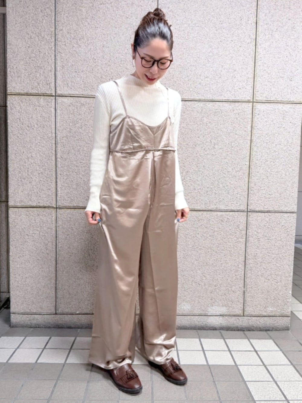 つやつやのサテン素材のサロペットを主役にしたスタイリング。 重たくなりがちなフルレングスのオールインワンも、光沢感のあるシャンパンカラーなら軽やかで華やかな印象に◎ タイトなリブニットをインナーに合わせることで、高身長さんの縦のラインをよりスマートに強調します。 足元にはブラウンのローファーを添えて、全体を優しく引き締めるのがポイント◎