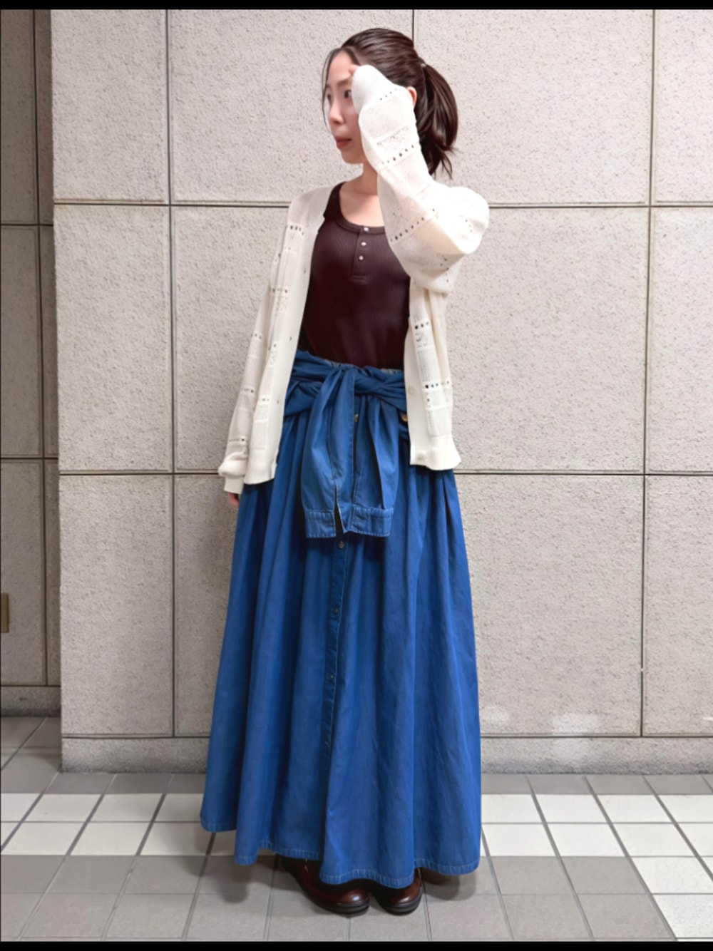 デニムシャツワンピースの上半身部分を腰に巻いて、スカート見せコーデに。 透かし編みニットカーディガンを合わせました。 173cm、全てMTT着用しています。