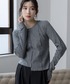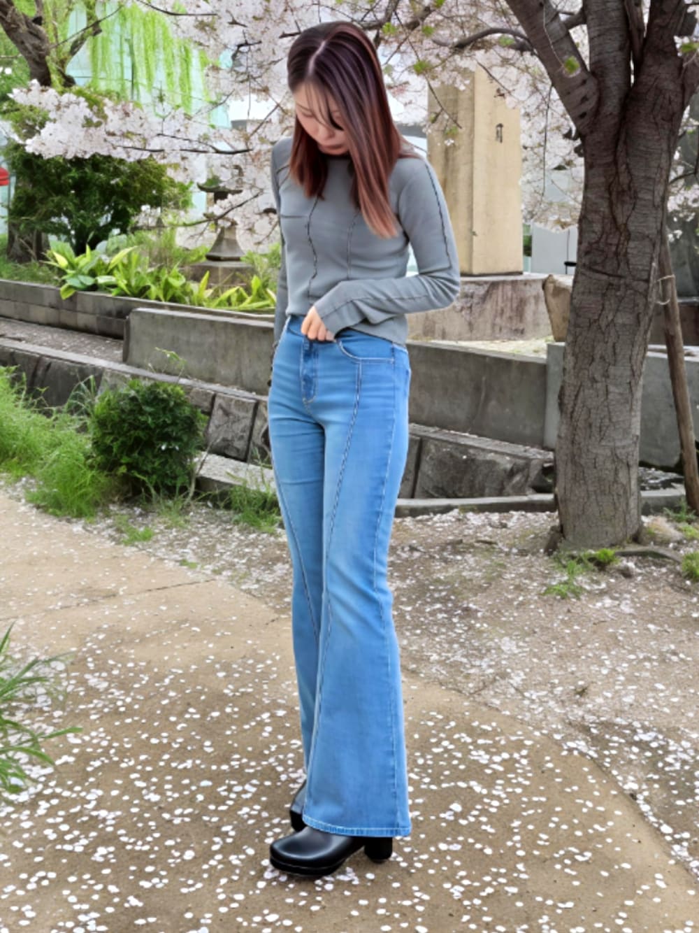 新作のフレアデニムパンツは足が綺麗に見えるようにステッチが入ったデザインになっています。 アシメデザインのカットソートップスを合わせて脚長に見えるコーデにしました。 身長173cmでいずれもMTTサイズ着用しています。