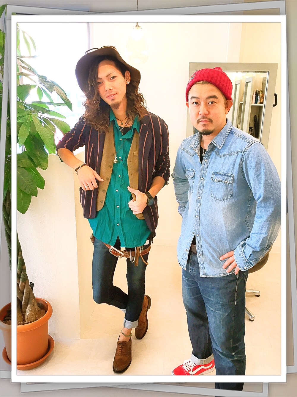 今日はうちのオーナーと二人で! 朝のひとときです! ぼくはブラウンのハット、ベスト、シューズで揃えてみました! オーナーはレッドのニットとシューズ、デニム×デニムで合わせて揃えてます!