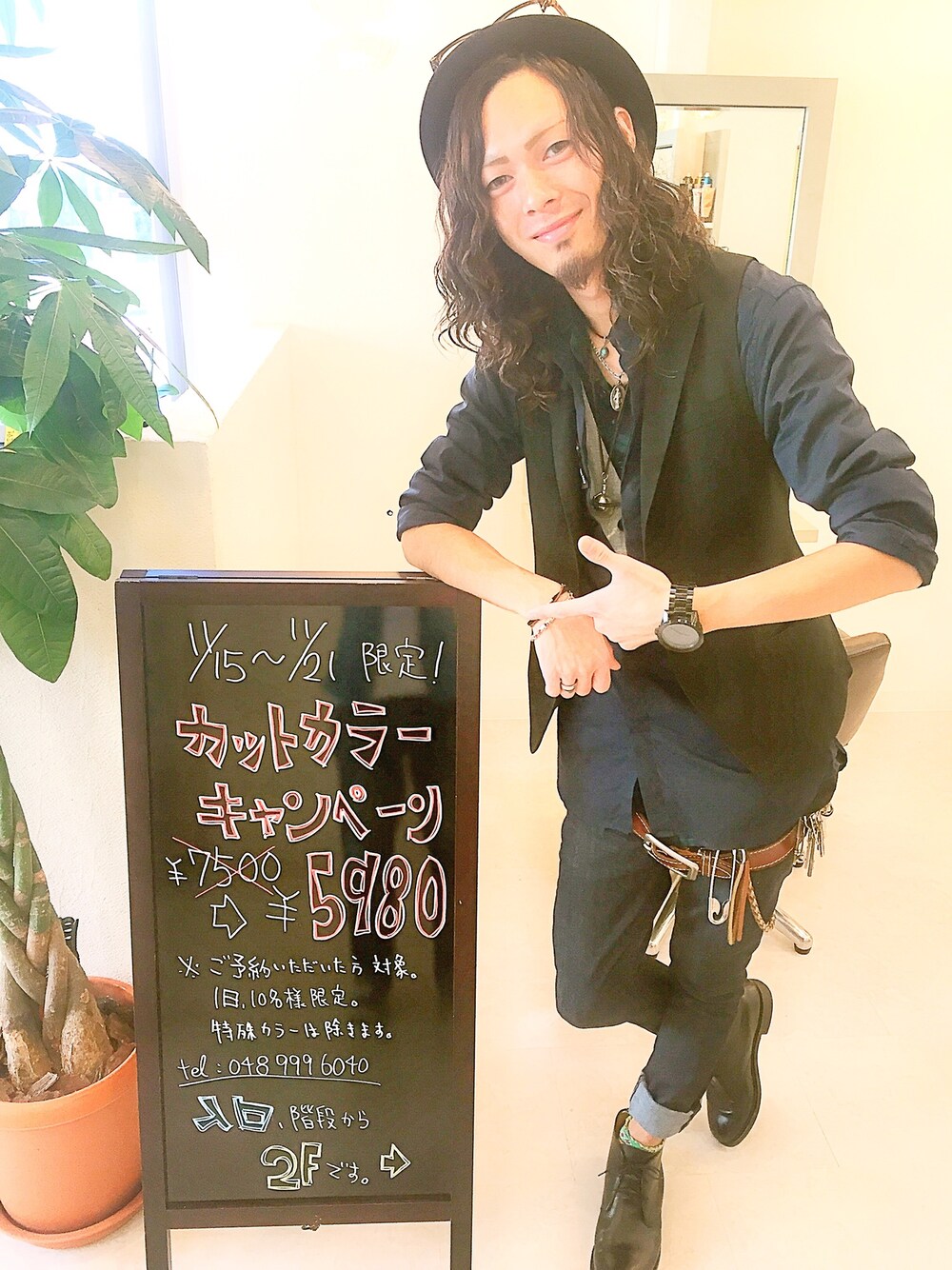 看板と共に!笑 今日はネイビーとブラックで揃えました! 暗くなりすぎないように差し色に、中にグレーのベストを着ています!