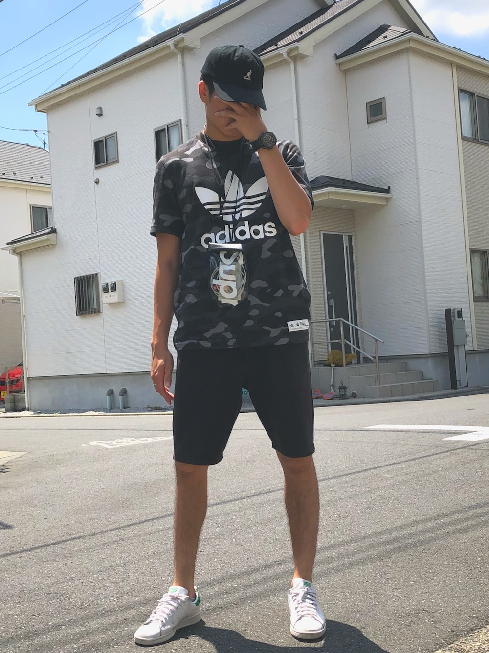 珍しくadidasコーデ 久しぶりにsupremeのポーチ的なの使いました〜防水なんで海とかで活躍です!🏝 adidas × bapeのTシャツ一目惚れでオンラインで購入しました!! 黒迷彩柄で生地もとてもよく着心地がすごくよいです後ろの首元にbapeのマークあるんでワンポイントですごくかわいいです!!