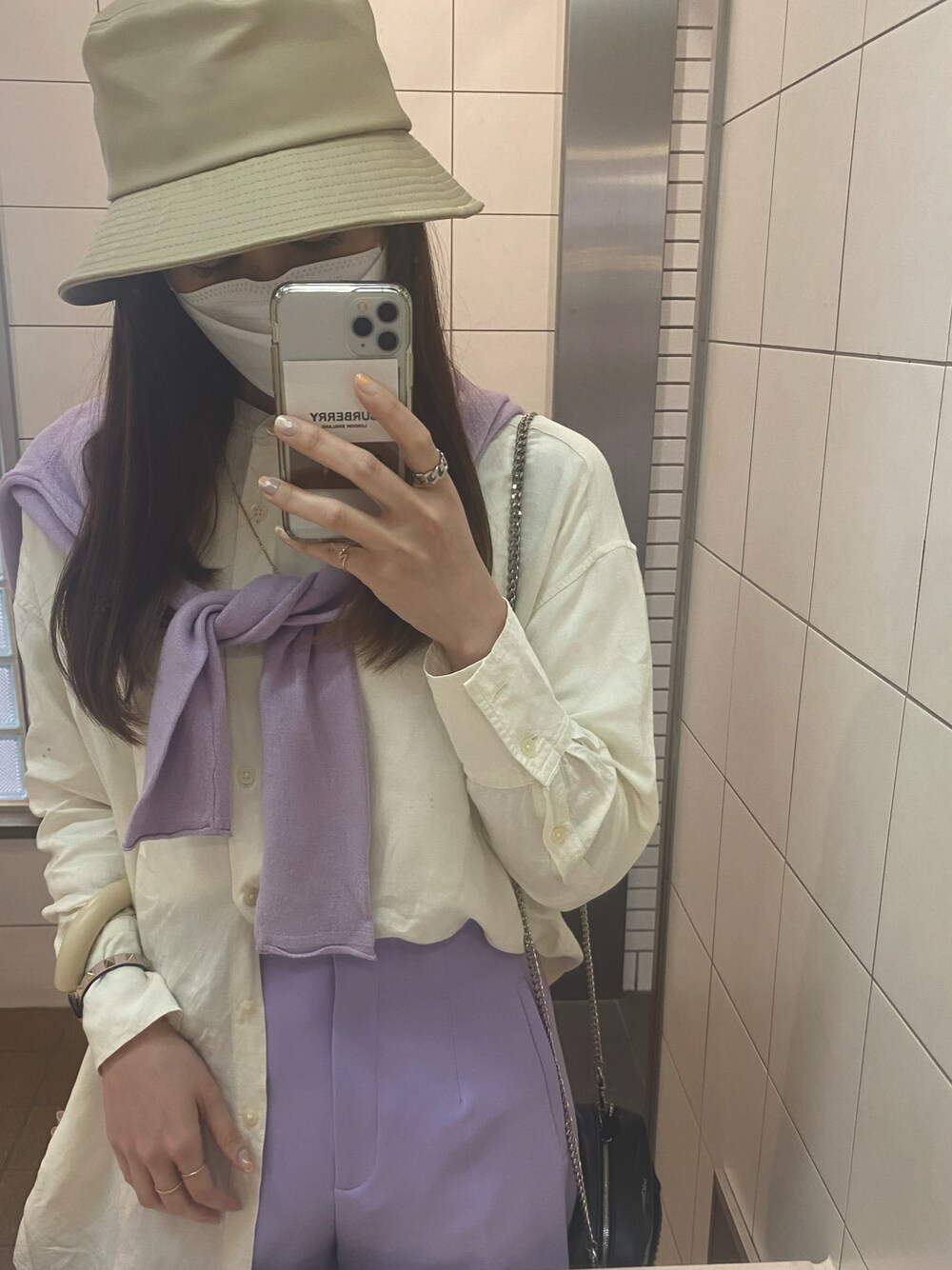 ベージュ×パープルコーデ🌂💟 バッグ、バブーシュは黒で全体的に絞めてます。 Instagram更新多めです✨ →@im17_12