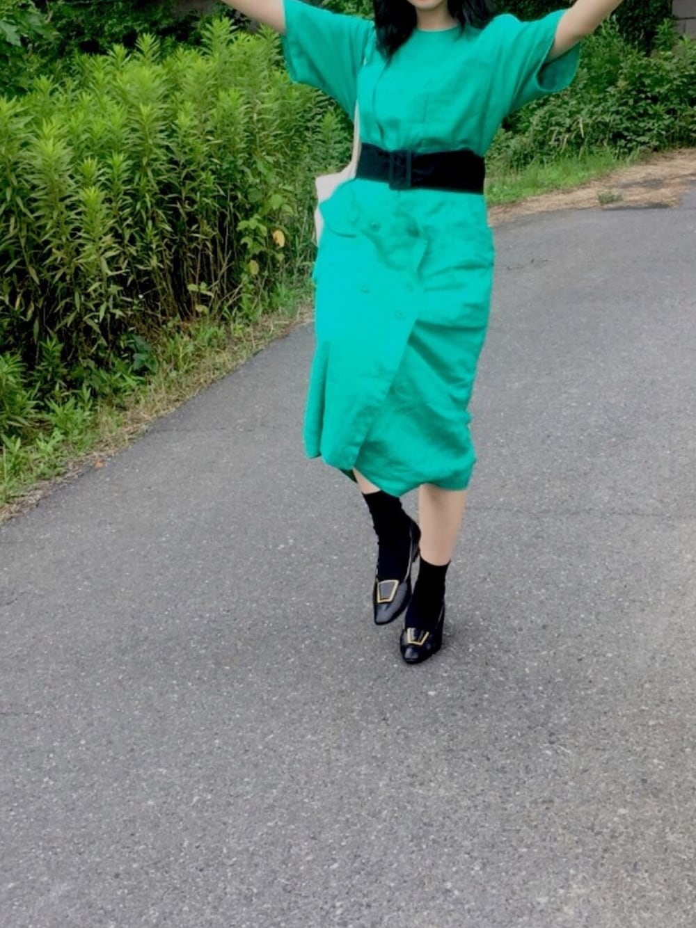 グリーン系のワンピース/ドレス、ブラック系のパンプスを着用したレディースの夏コーディネートの1枚目の写真