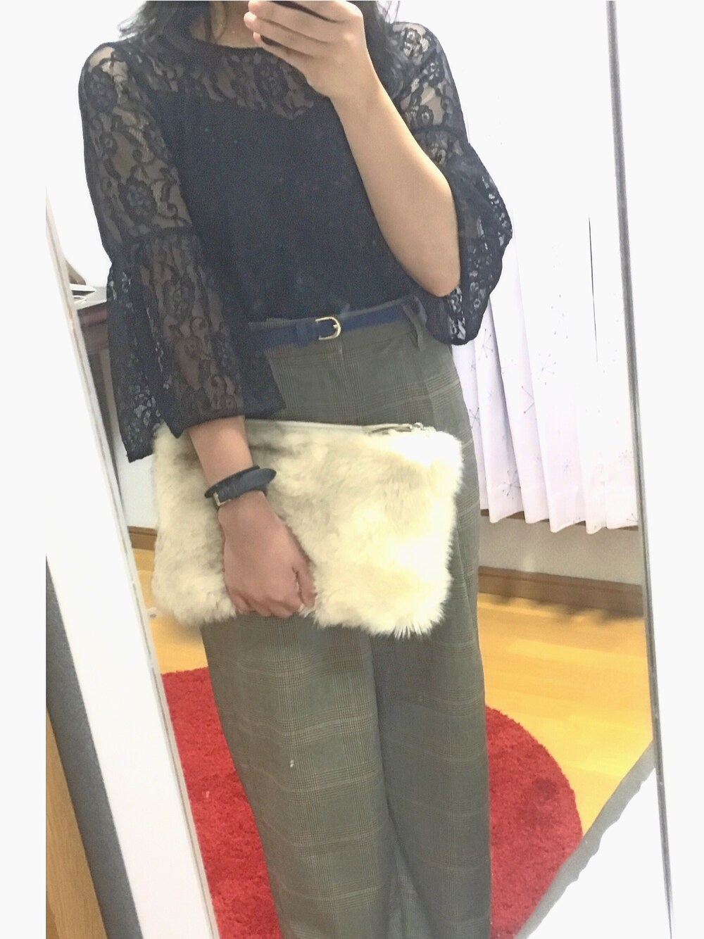 レース×グレンチェック=秋コーデ 小物はファーでアクセント エエ女感www 観覧して頂いたら 鼻水出して喜びます😇❤️