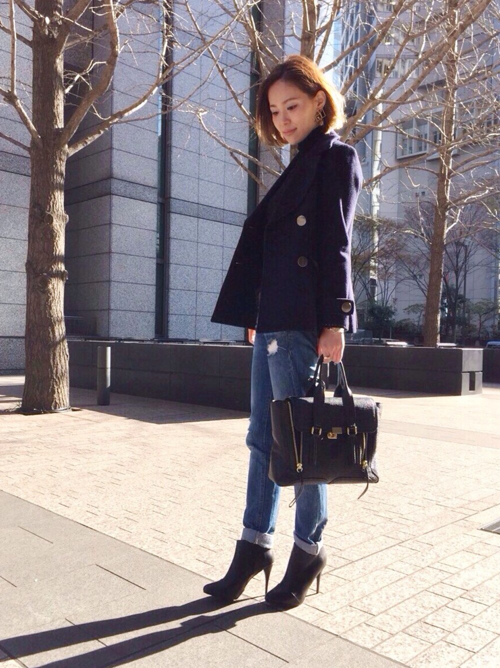 ピンヒールがきれいなショートブーツ シンプルなデニムスタイルも大人な雰囲気に〜 しれっと立ってますが寒くて半泣きでした、、