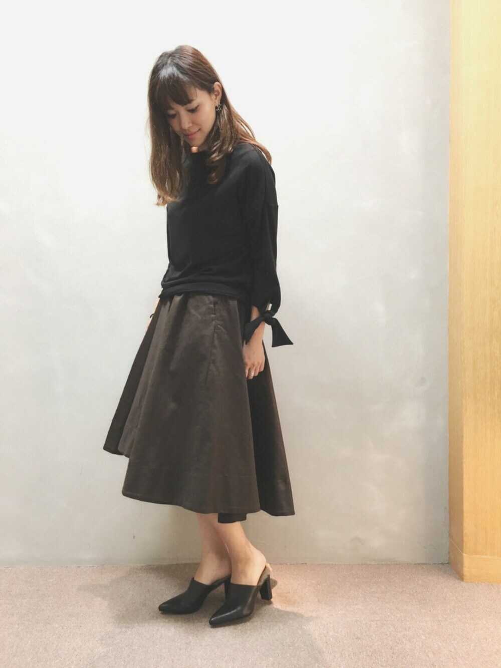 後ろが長くなったアシメデザインのスカートは、いつもより少し重ためですが、その分裾にボリューム感が出てかわいいです💫 足元をファーミュールにするだけで一気に今年っぽく〜〜〜💁
