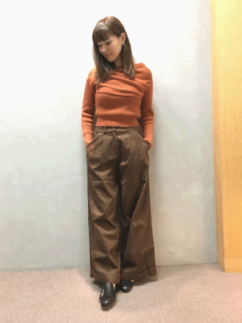 オレンジとキャメルの組み合わせが今年らしくてお気に入りです🌟 チクチクしないニットなので、インナーを選ばず着れます!