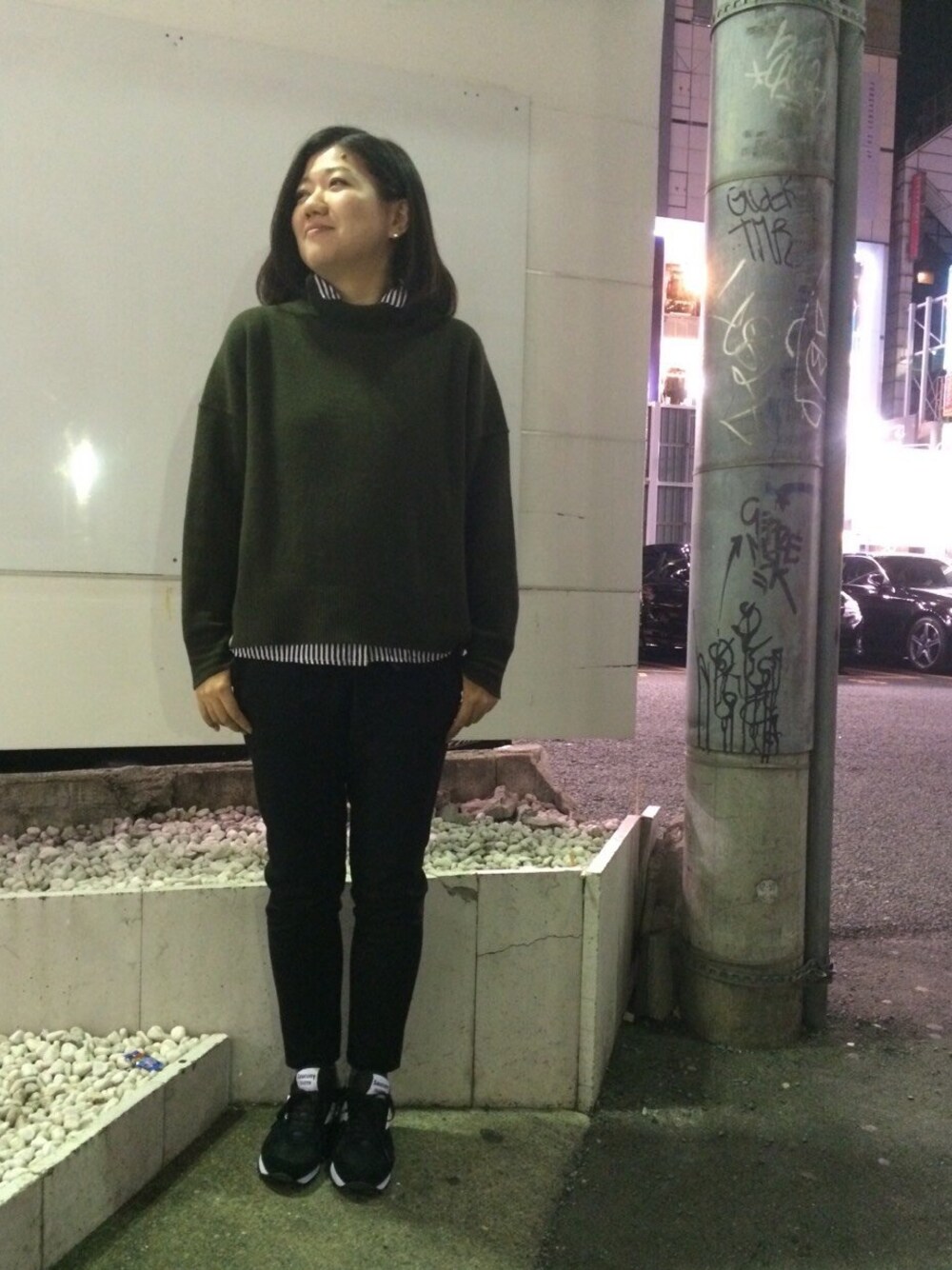 【本日のスタッフ】 今日は色味もシックにまとめて大人女子に! でも足元はスニーカーではずします。 流行りのSACONY。