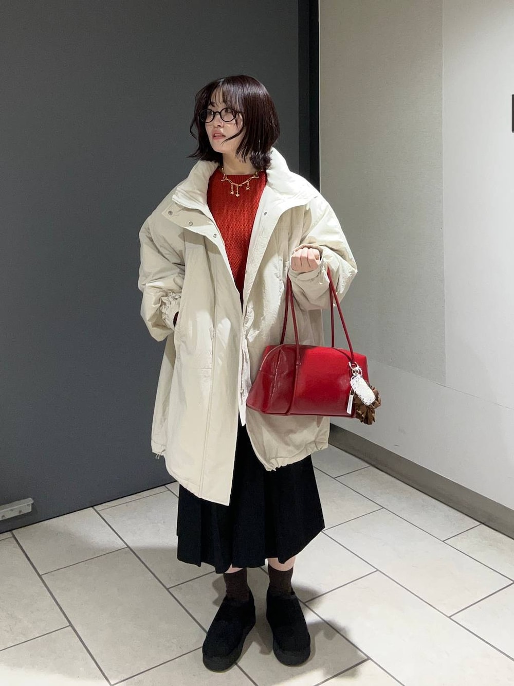 毎年大人気の定番アウター⛄️❄️ 今回はロング丈を着用しています⭐️ 冬はアウターでコーデが埋もれがちなので、差し色を使ってアクセントをつけるのがおすすめです🧏🏻♀️🎶 今回は赤を差し色にコーデを組んでます🫧 アクセサリー等の私物はinstagramに✅ ぜひフォロー、お気に入り、その他投稿のチェックも併せてよろしくお願いします🌠