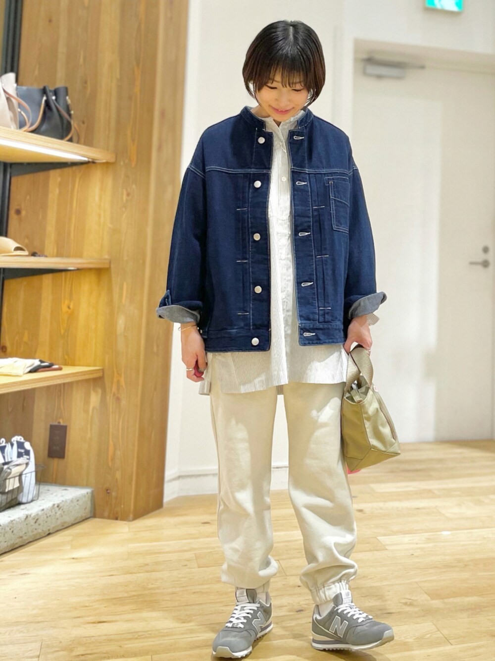 デニムジャケットを主役に、メンズライクなカジュアルコーデ! FORK&SPOONのスウェットパンツは、キレイなシルエットでラフになりすぎずに着用できますよ◎