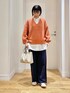 オレンジが可愛いニットは、綺麗なカラーやボリュームスリーブがポイントになっていて主役になるアイテム! 今回は、少し春を意識してインナーにストライプのシャツを合わせてみました! ぜひ、お試しください。