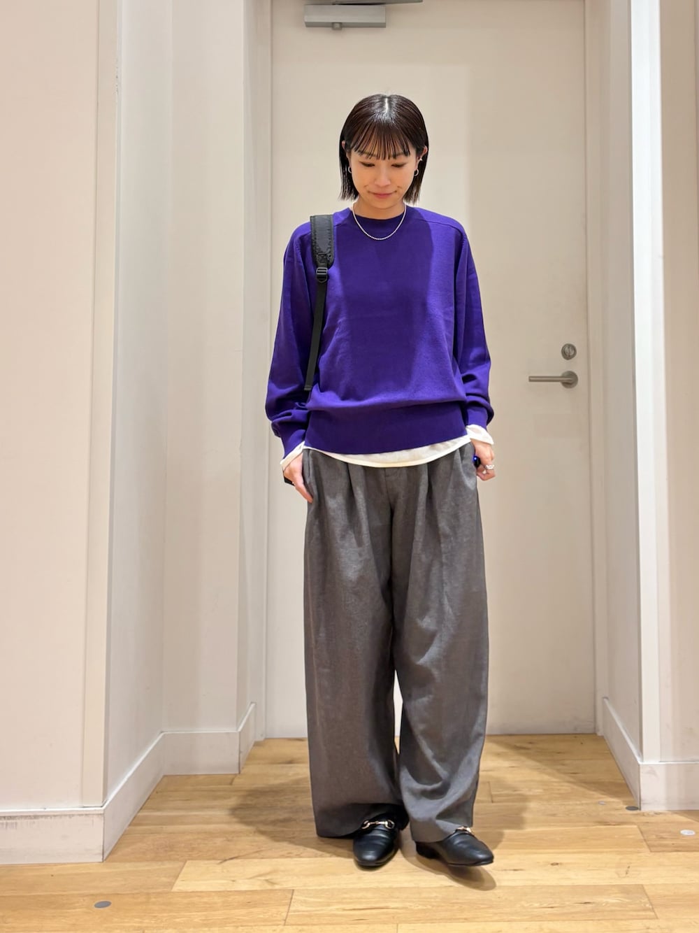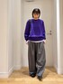 キレイなパープルのニットを主役にシンプルなカジュアルコーデです! 柔らかい生地感で着心地が良く、程よくゆとりがあるサイズ感で楽に着用できました◎ デザインはシンプルなので着回しもしやすく、秋口から活躍間違いなしですね! ぜひ、お試しください。