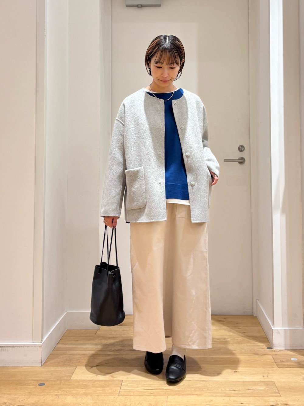 ウールのコートは、ゆったりシルエットなので厚手のアイテムとも合わせやすく、温度調節がしやすいので長い時期にお使いいただけます◎ 軽い着心地でノンストレスですよ! インナーには、キレイなブルーが目を惹くニットを合わせてポイントに♪ ぜひ、お試しください。