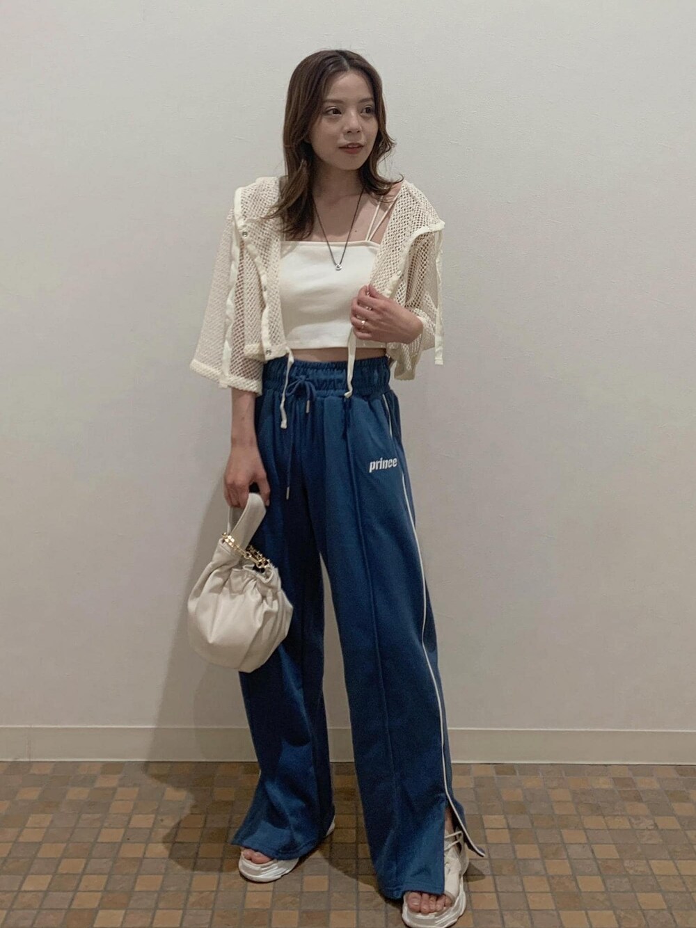 汗をかく夏は楽ちんでいたい!! スウェットパンツを今っぽいクロップド丈のメッシュカーデで合わせた大人のタウン系コーデです。 低身長なのでゆったりパンツの時 トップスは肌見せで抜け感をだしました!