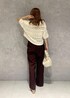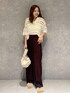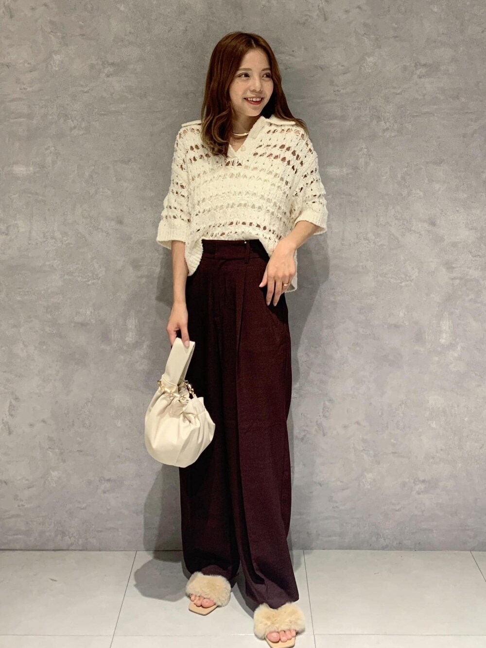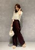 秋を感じるニットアイテムも 9月から着用できるさらっと素材です ワインカラーでクラッシック度高まる きちんとコーデにしました!! ウェーブ→半袖&襟付きのハンサム感苦手なのでボタン開けて抜襟で女性らしい肌見せ◎ファーの柔らかさが◎