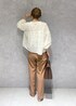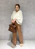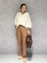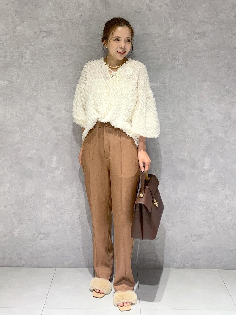 低身長はボトムスがマンネリになりがちなので 今季注目のデザイン性のある フェザー調ブラウスで華やかに!! ファーサンダル、ヴィンテージカラーのバックで 秋のムードを感じるコーデにしました!