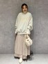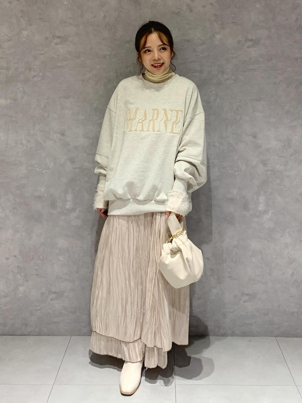 レベーシックになりつつあるレイアード もう一味プラスした上級者なのが今っぽい!! トレーナー自体がニュアンスカラーでオシャレ♡ 袖先にファーがついたシアーインナーで 周りと差がついた印象に!! 動きがエレガントなサテンスカート合わせれば 大人のフェミニンなコーデになりました!
