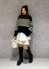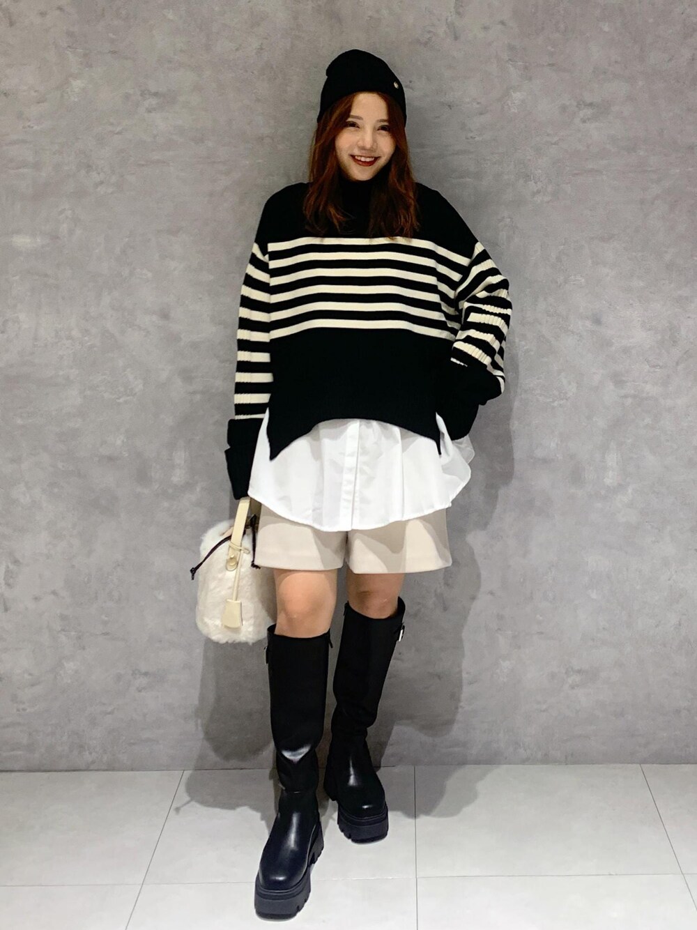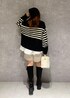 モノトーンなカジュアルスタイルに ロングブーツで膝上を出して 見せてる感なくフレッシュな印象に!