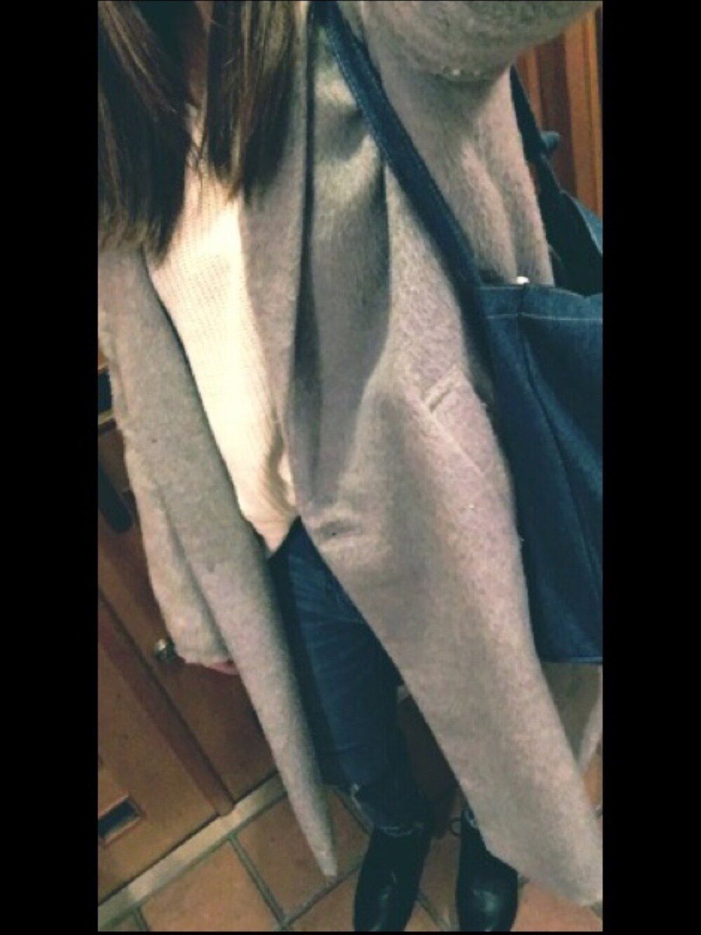 ブルー系のデニムパンツを着用したレディースの冬コーディネートの1枚目の写真