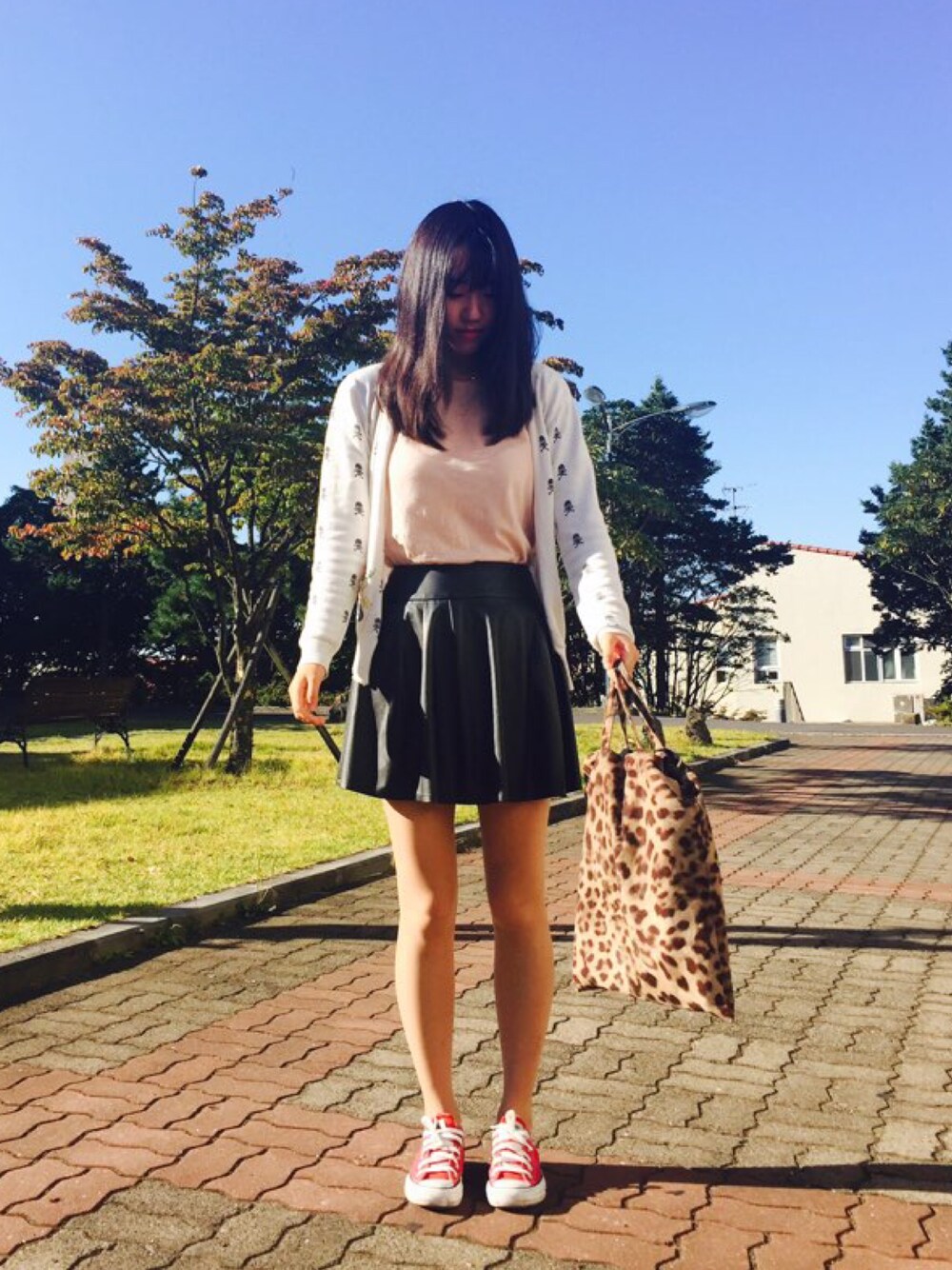 Skull cardigan + Black leather skirt + Red converse = Ms. Autumn