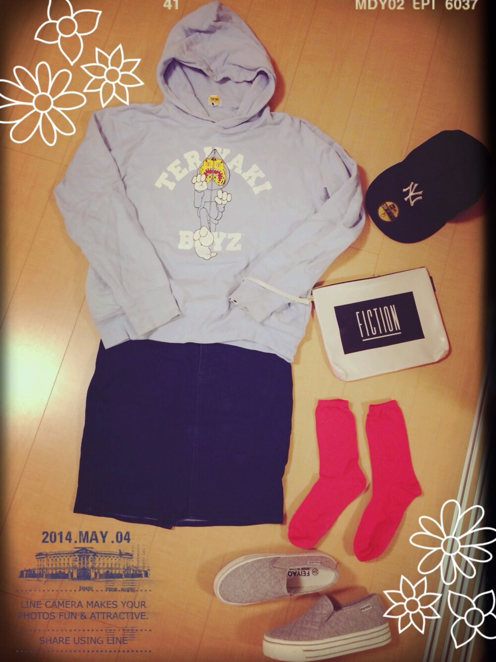 エイプとテリヤキボーイズのコラボパーカーを古着屋でGETしました♡めっちゃ可愛い♡ 足元はあえてピンクのソックスをアクセントにしてみたよ♡(ʘʖ̮ʘ)