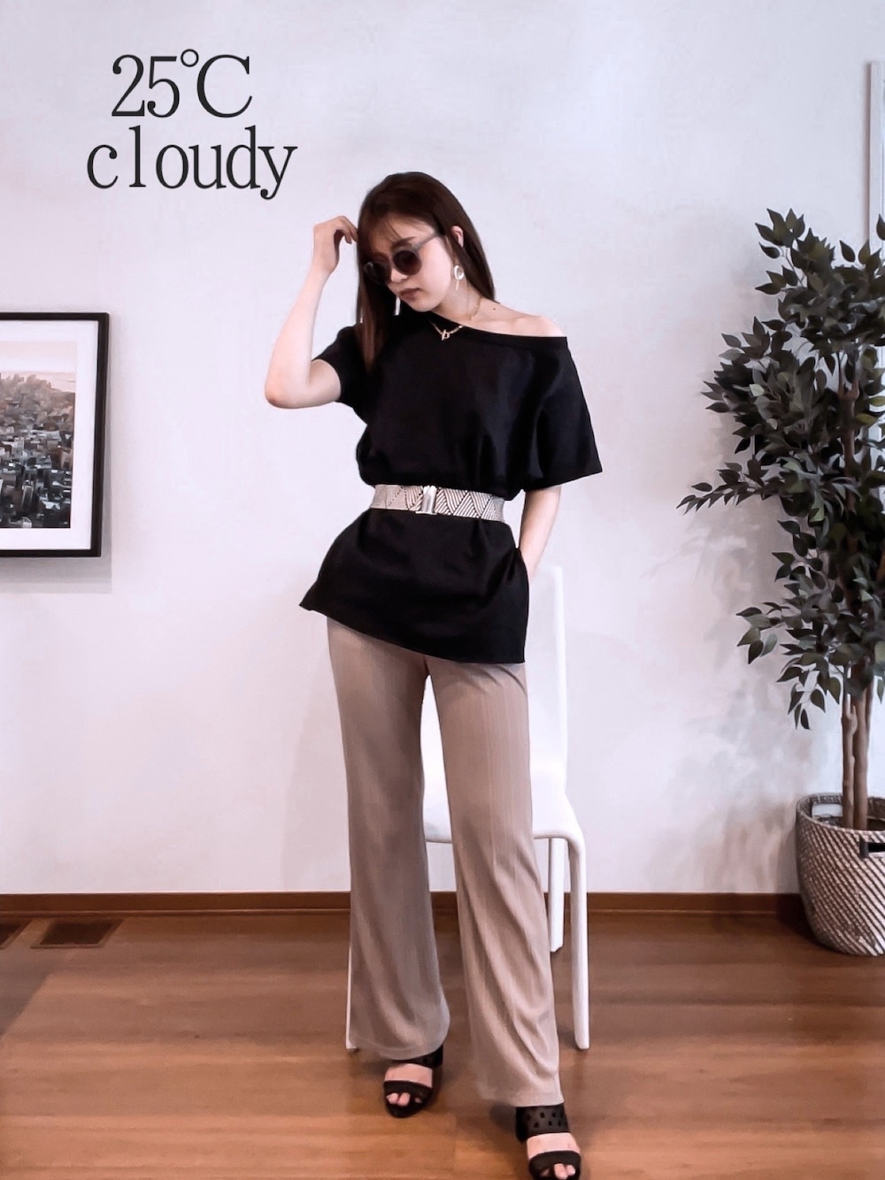 ご覧頂きありがとうございます😂 少しでも洋服選びの参考になってれば嬉しいです。 ▶Instagram:@fuku_kion 違う角度からの写真載せてます! _________code____________ 天気は曇☁️ 最高気温は25℃くらいで風はちょっと 湿度は78~92% そんなこの日のコーデは 【ブラック×ブラウン🕶】 ⚑︎ベルトでウエストマーク このトップスはワンショルでも オフショルでも普通にも着れて 好きなやつ!買ってよかった◎ スキニー合わせもすきなので 今度はスキニー合わせで着る予定🙂