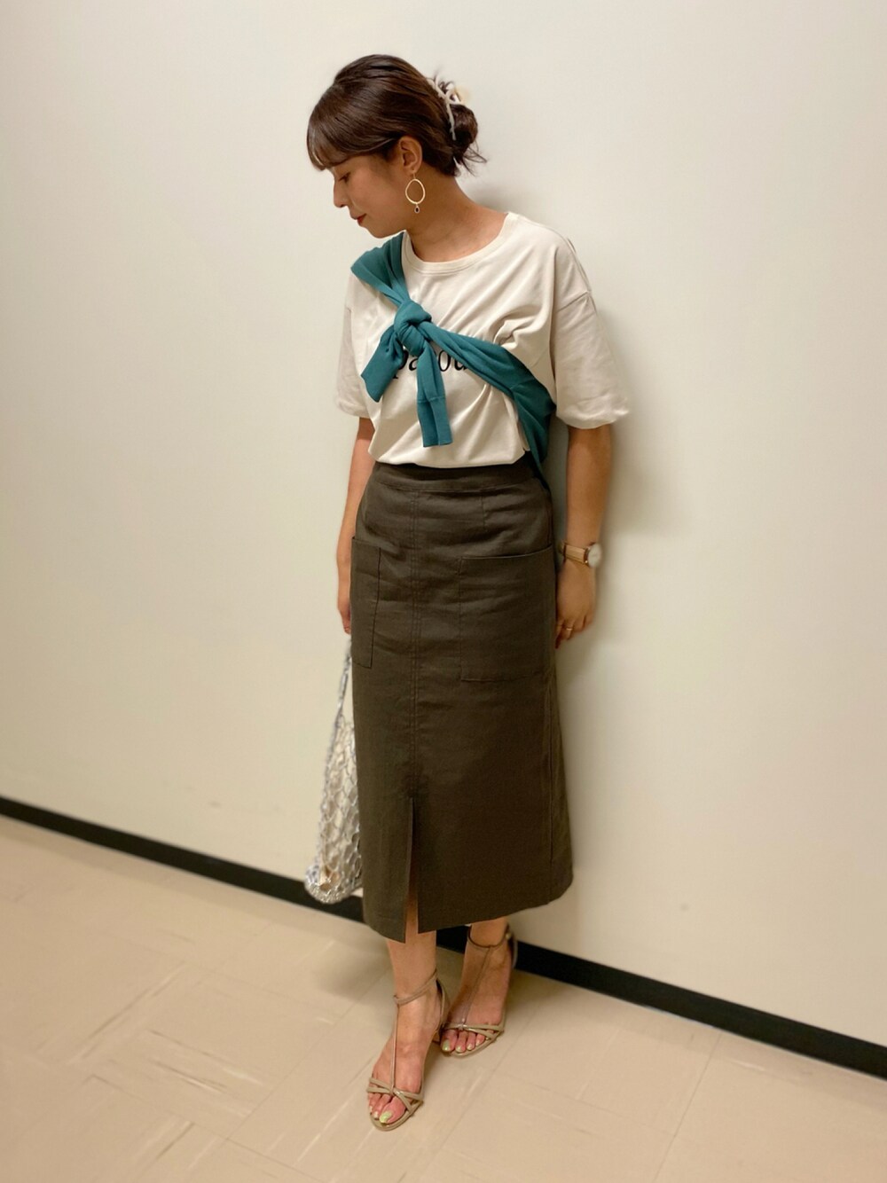 カラーもののカーディガンを巻いて、普段のコーディネートのアクセントに!ロゴTはシンプルなアイテムなので、組み合わせもしやすいTシャツです。タイトのスカートを合わせて大人カジュアルな印象のコーディネートに仕上げました☺︎