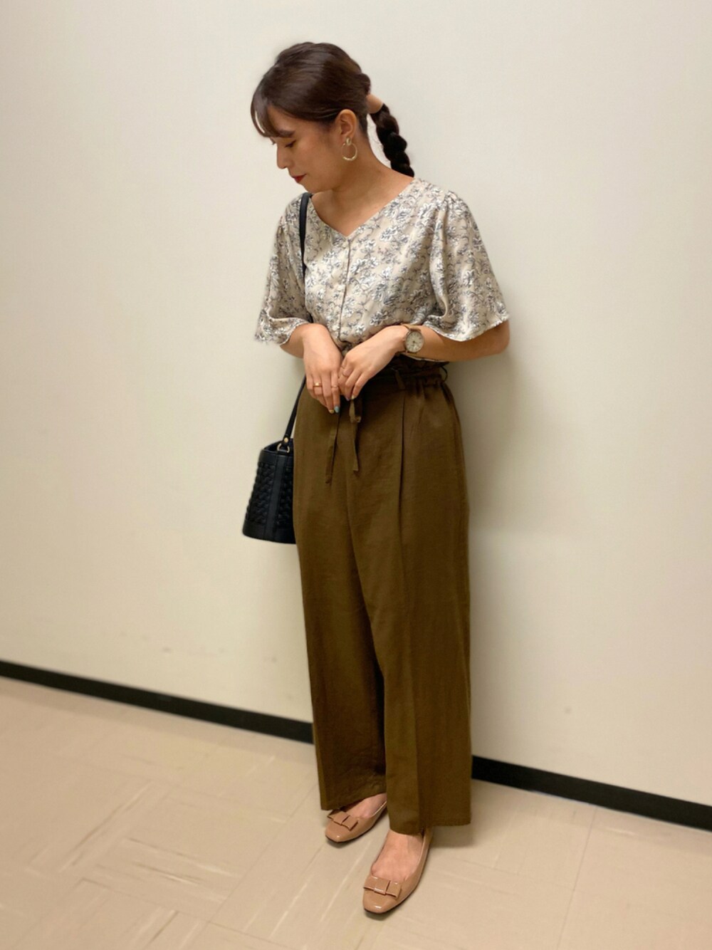 花柄のブラウスは着るだけでお洒落に見せてくれる優れものアイテムです!首周りのディテールもゆったりしているので安心して着ていただけます。パンツに合わせて花柄の甘めな印象を抑えてコーディネートしました☺︎