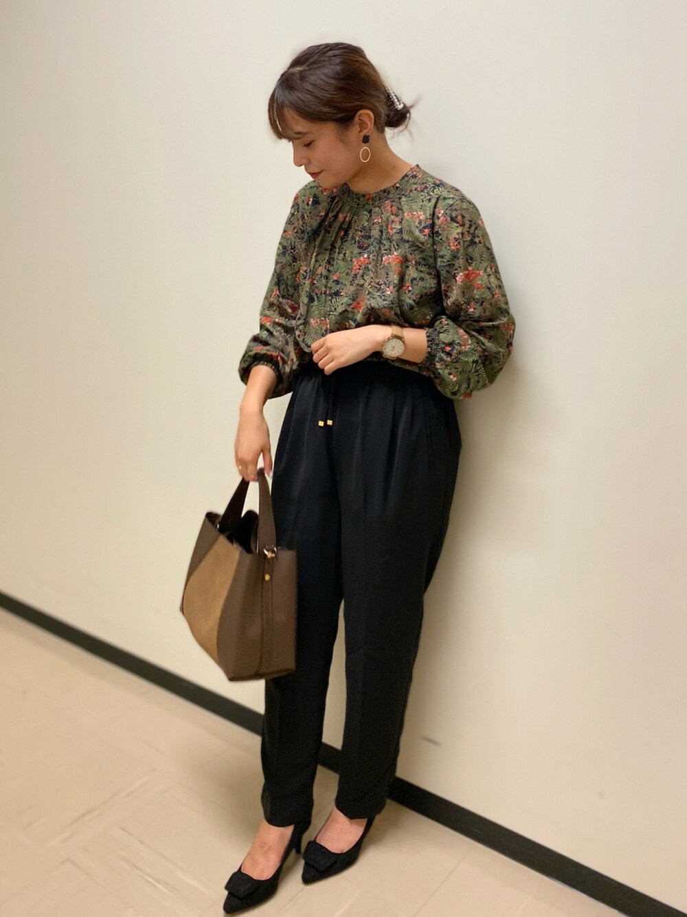 トップスで着ている花柄ブラウスは、写真映えもするような一枚になっております!柄物アイテムなのでボトムスはシンプルなテーパードパンツを合わせて、より花柄のブラウスが引き立つようにコーディネートを組みました!