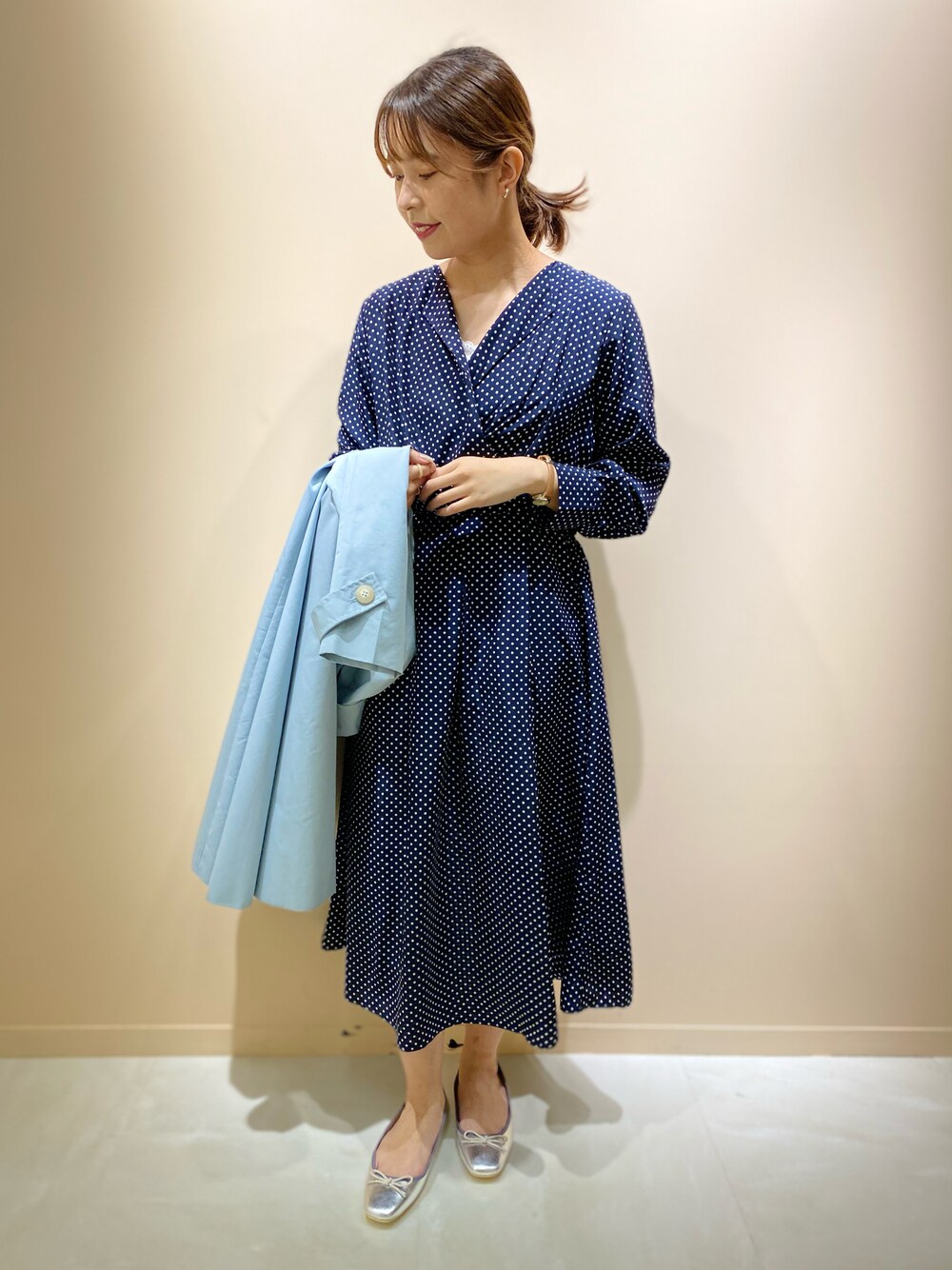 ドットの柄が細かいデザインなので、甘くなり過ぎず綺麗目な印象で着やすいワンピースです!生地感は柔らかく、肌触りの良い質感でご用意しております。迷った時の一着に使えて、トレンドを気にせずに毎年着回せるワンピースです♪