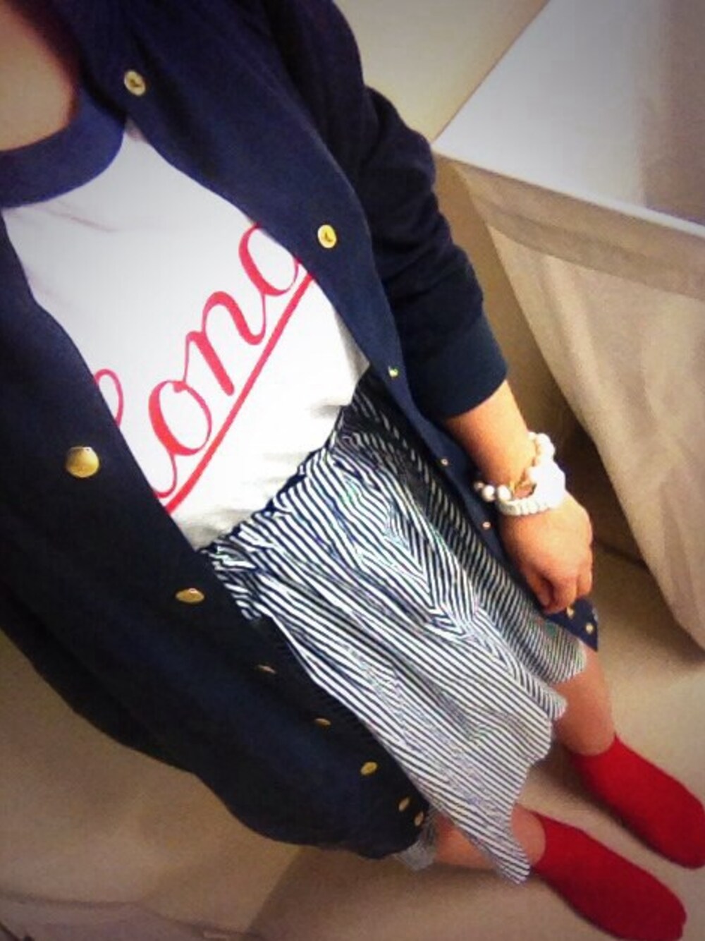買ったばっかりのストライプの フレアスカート。。♡(^_^) 赤を差し色にして、ネイビーと まとめました♡ チェイサー、お気に入り。♡*