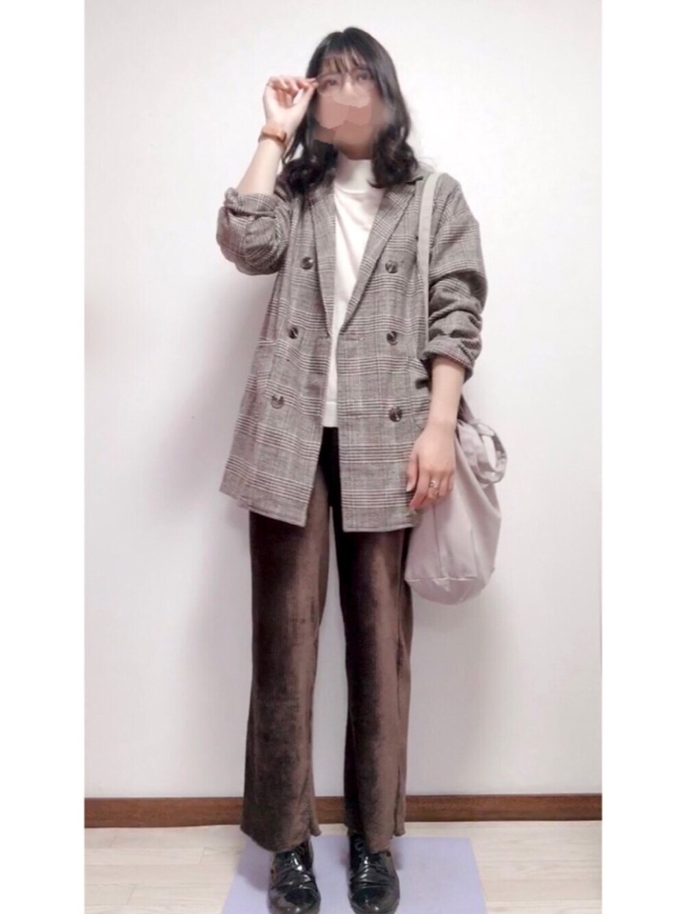 見ていただきありがとうございます🙇🏻♀️ ▪️ジャケット×ブラウン▪️ ベロア生地の控えめワイドパンツに、カッチリ過ぎないチェック柄ジャケット 大人っぽくて楽ちんなコーデです ポイントは、め・が・ね🤓